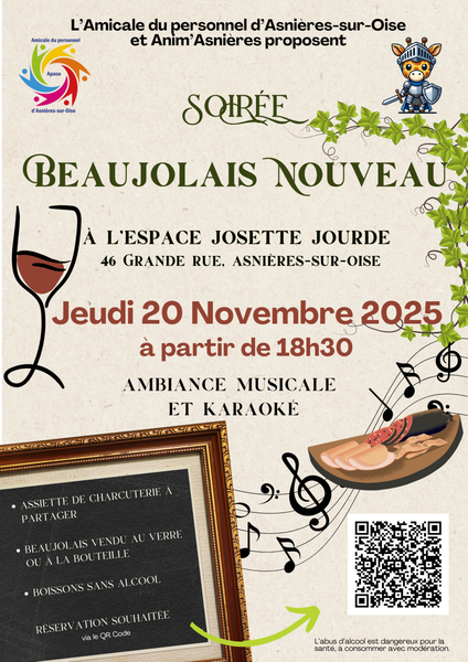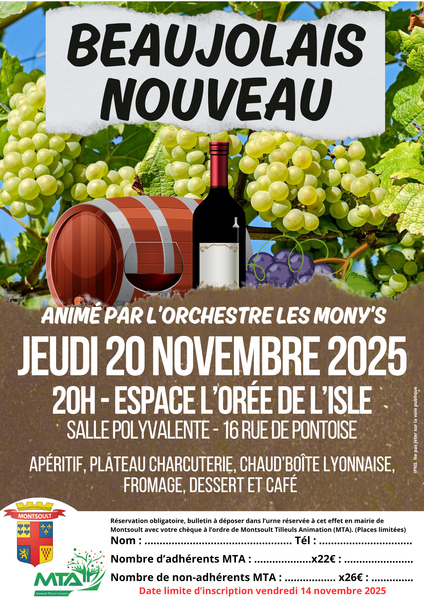 Fêtez l’arrivée du Beaujolais Nouveau à Montsoult ! Une soirée animée par l’Orchestre Les Mony’s à l’Espace l’Orée de l’Isle, avec apéritif, charcuterie, chaud’boîte lyonnaise, fromage, dessert et café dans une ambiance festive et conviviale.