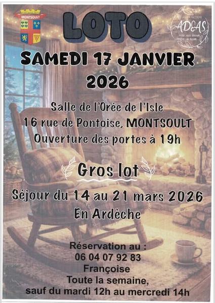 Ne manquez pas lasoirée loto à Montsoult ! Venez tenter votre chance au loto avec un gros lot exceptionnel : un séjour du 14 au 21 mars 2026 en Ardèche ! Ambiance conviviale et restauration sur place.