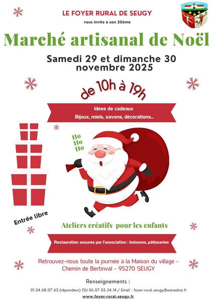Le Foyer Rural de Seugy vous invite à son 30e Marché artisanal. Idées cadeaux, ateliers pour enfants et restauration vous attendent à la Maison du village, chemin de Bertinval.