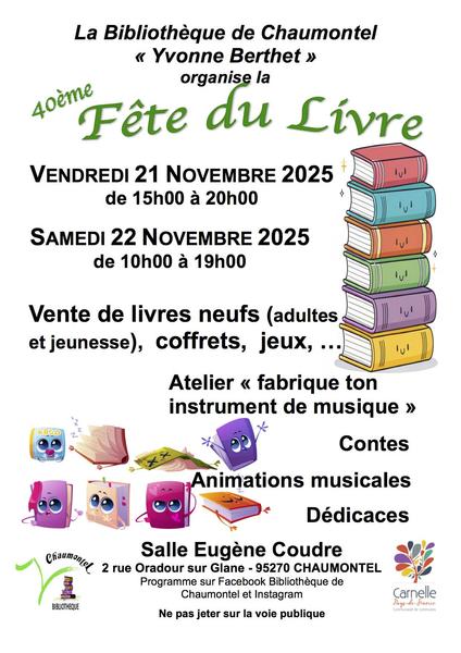 Venez célébrer la 40ème édition de la fête du livre ! A cette occasion, découvrez livres neufs, coffrets, jeux et profitez d'ateliers, contes et dédicaces.